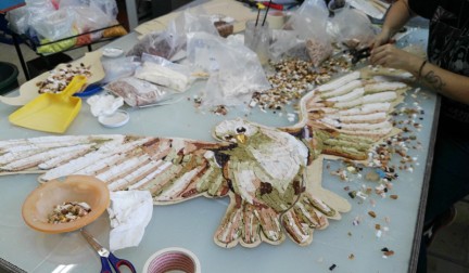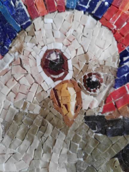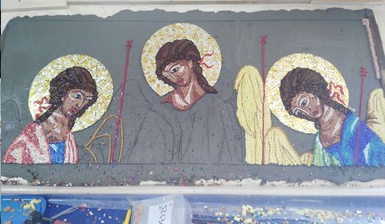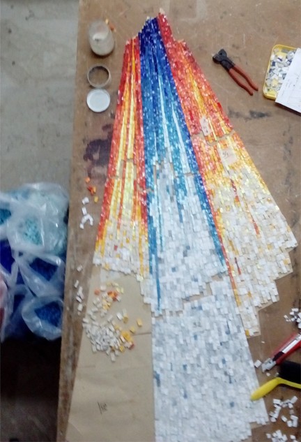 In laboratorio si lavora sui disegni di fondo già colorati e si posizionano, dopo averle tagliate, le tessere che vanno a formare il mosaico previsto. Si ottimizza il tutto incollando su un supporto, sia esso ligneo, metallico o di altra natura, le tessere del mosaico stesso permettendo di traslare l'opera sulla parete o oggetto da ricoprire.